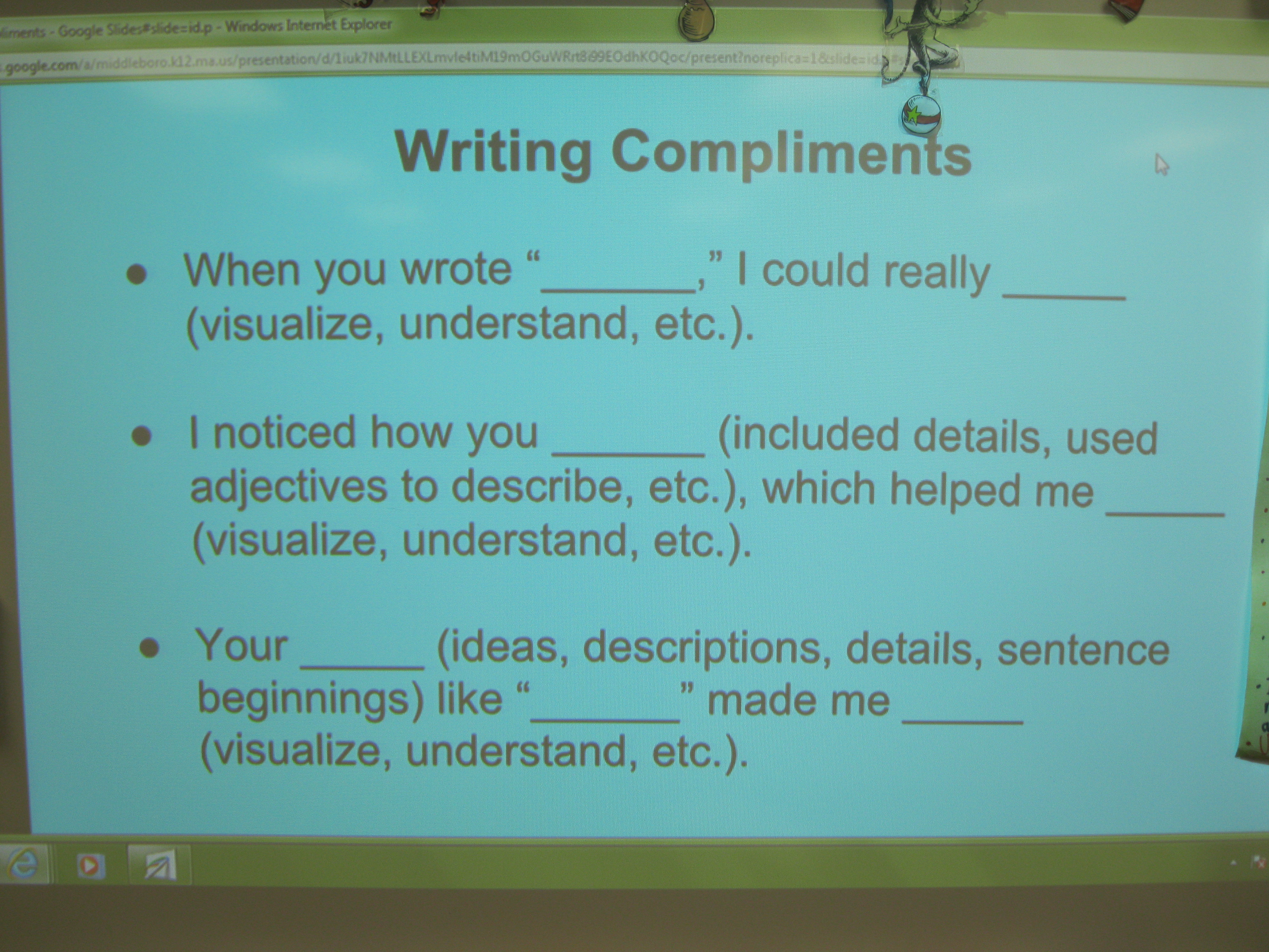 After composing their compliments, students delivered them to each other. One student said, “It’s like valentines!” Another piped up and said, “But better!” 🙂