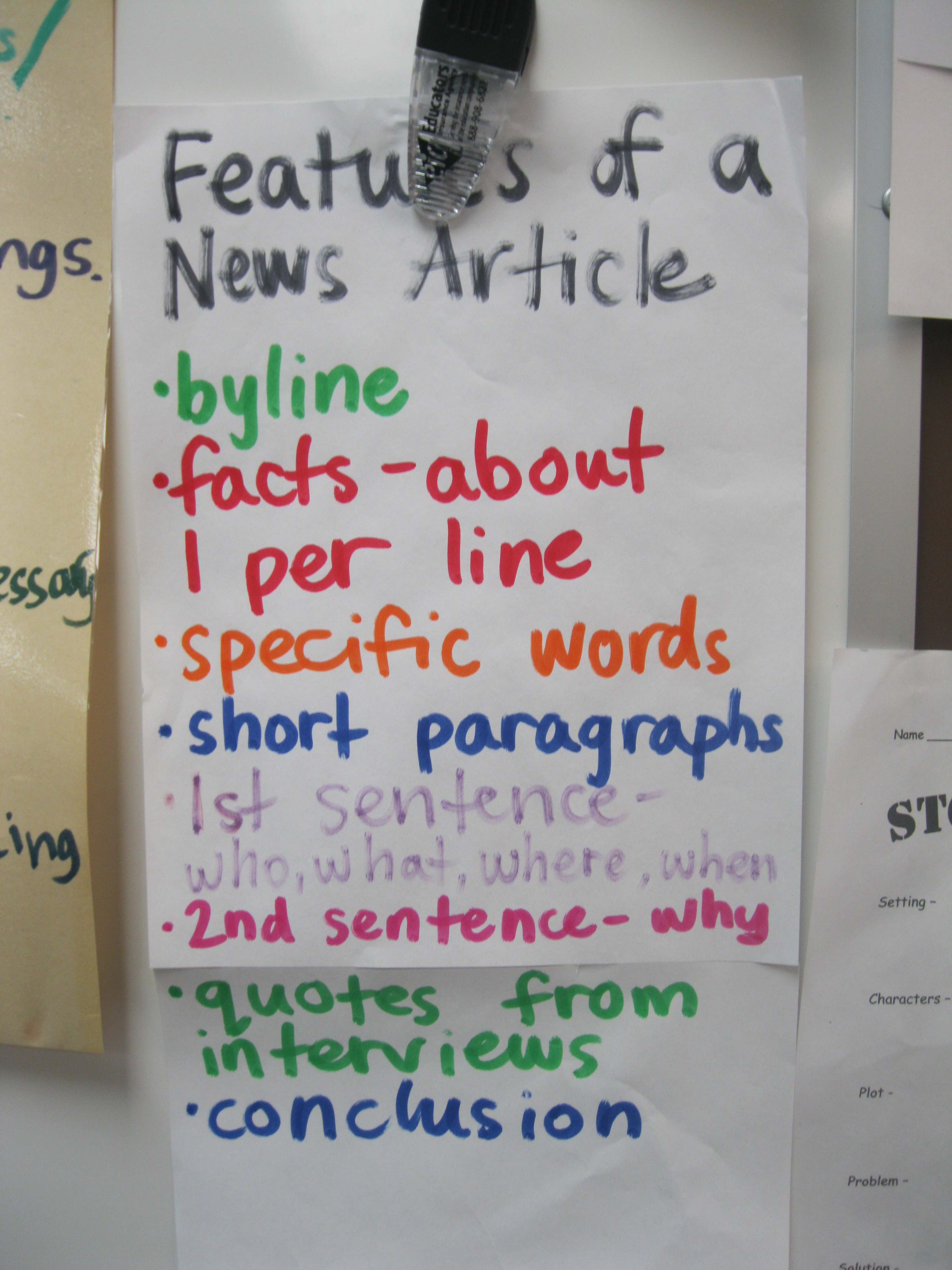 The writers kicked off the final session by silently going through their Writing Folders, Writing Notebooks, and resources they’d collected over their fifteen sessions. We discussed how we’d used these materials to become stronger writers. We also discussed the features of a news article that they’d incorporated in their final drafts.