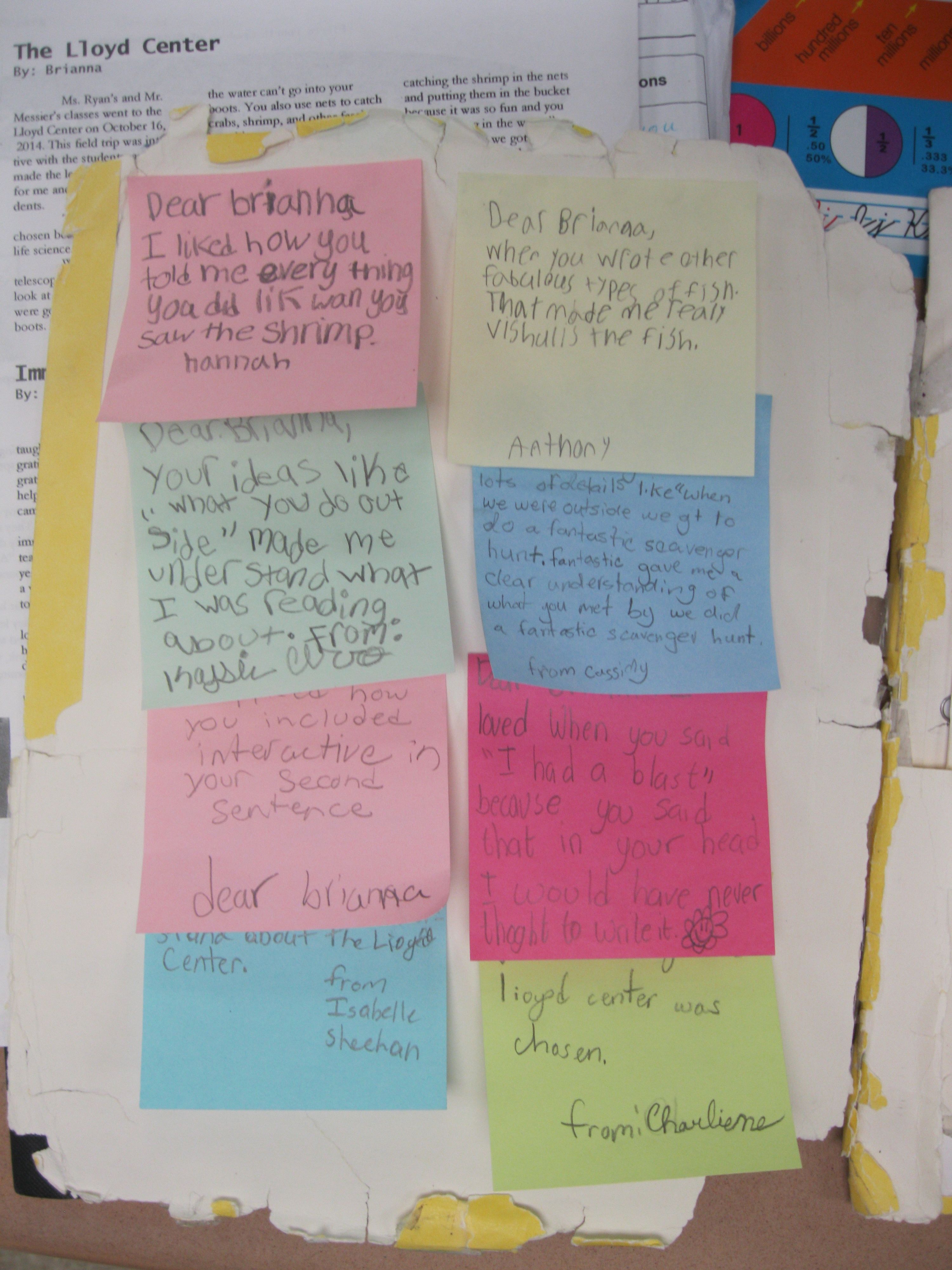 During our sessions, we repeatedly told our reporters that writing isn’t a solitary activity. Writers share. Writers work together. To reinforce this sentiment, students read each other’s final drafts and wrote specific writing compliments on sticky notes to each reporter. To help them get started, we shared a list of options.