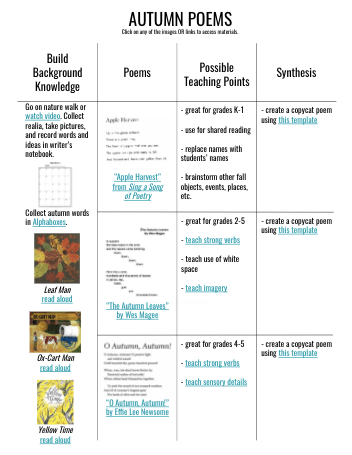 Since it is the most gorgeous time of year in New England right now, I decided that next week’s theme will be AUTUMN! To get students in the writing mood, I *highly* recommend taking them OUTSIDE for a nature observation walk. Check out the poems I selected and my resources and ideas for teaching them by clicking on the image or link above. Happy poem writing!