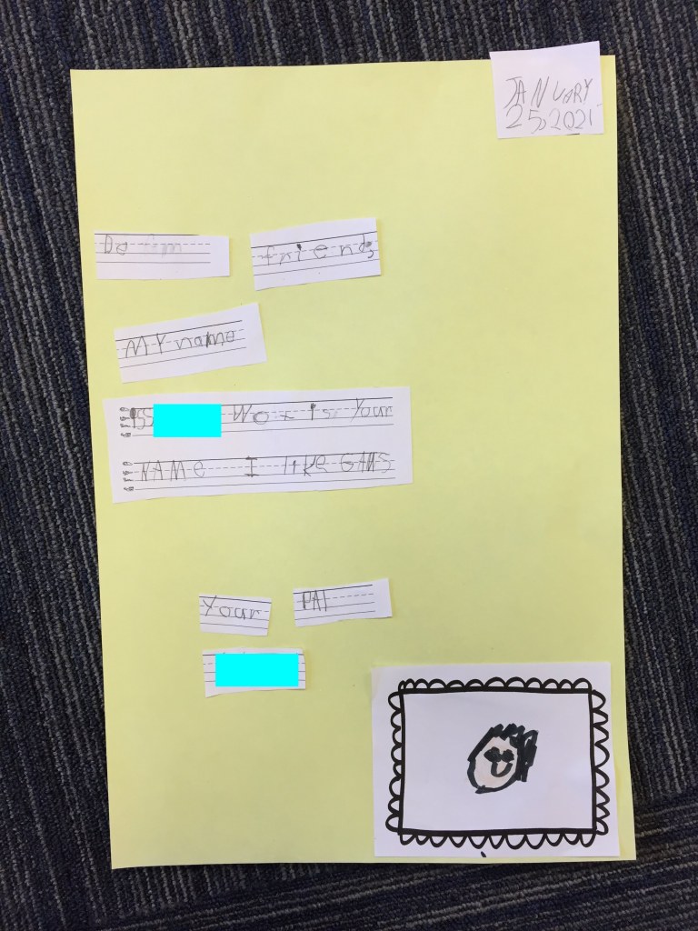We wrote our first friendly letters: “Dear pen pal or kindergartener or friend,…”. Students had to write a sentence about themselves, and then ask a question.