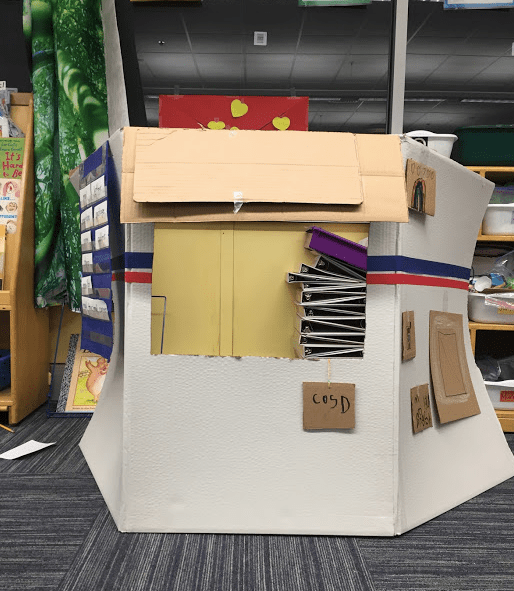 Don’t worry, I didn’t break the state’s travel orders. Over winter vacation, my family bought stock kitchen cabinets to build an island in our kitchen. The cabinets came in these huge boxes, and after emptying one, I noticed that it looked like a little store with an awning. It just needed a window. And you know that thing teachers do where they’re constantly saving things “just in case” they could use it someday? I did that. I threw one of the empty boxes in my basement. Just in case. A few days later when a Christmas present was delivered, I instantly envisioned the empty Fedex box as a mailbox. Down the basement stairs it went. That cabinet box that looked like a shop? It clearly had to become the accompanying post office. My youngest son and I spent one afternoon of that break turning them into these:
