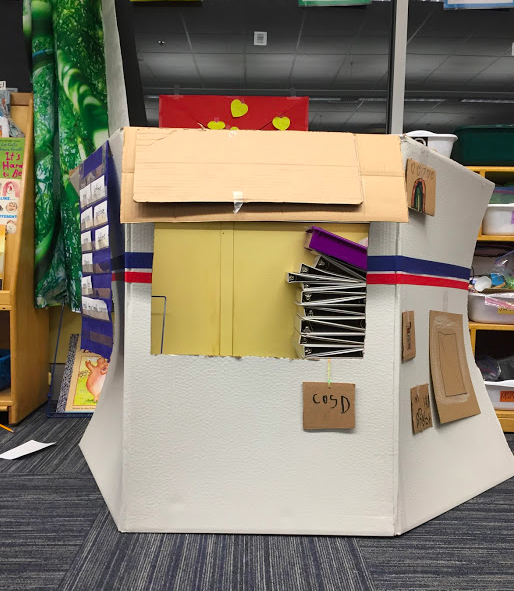 Don’t worry, I didn’t break the state’s travel orders. Over winter vacation, my family bought stock kitchen cabinets to build an island in our kitchen. The cabinets came in these huge boxes, and after emptying one, I noticed that it looked like a little store with an awning. It just needed a window. And you know that thing teachers do where they’re constantly saving things “just in case” they could use it someday? I did that. I threw one of the empty boxes in my basement. Just in case. A few days later when a Christmas present was delivered, I instantly envisioned the empty Fedex box as a mailbox. Down the basement stairs it went. That cabinet box that looked like a shop? It clearly had to become the accompanying post office. My youngest son and I spent one afternoon of that break turning them into these: